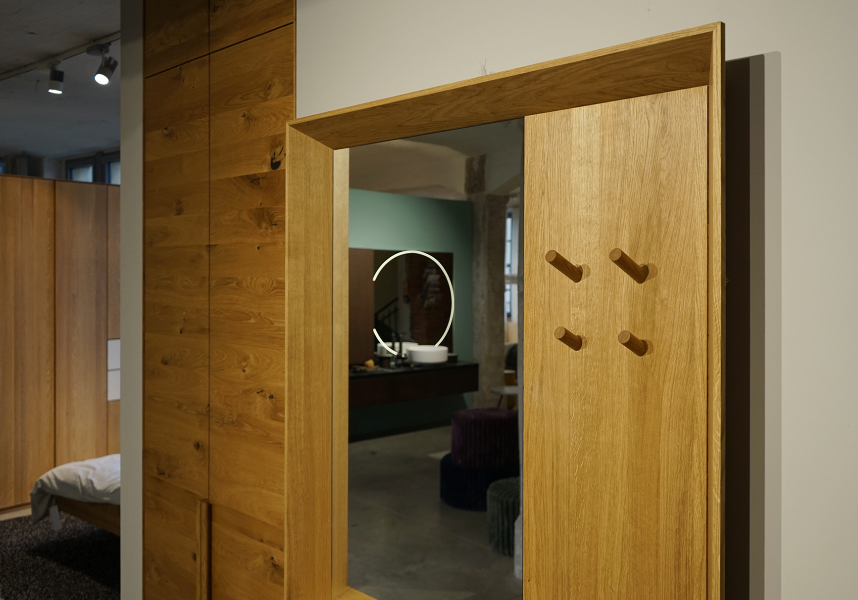 haiku ist in seiner Reduktion und Konkretheit stark von der gleichnamigen japanischen Gedichtform inspiriert. Dabei lenkt der schräggestellte Holzrahmen in seiner Schlichtheit den Fokus förmlich auf das Wesentliche. Gestalterische Raffinesse zeigt sich auch an der gefasten, zarten Vorderkante, die haiku trotz der soliden Materialität elegante Leichtigkeit verleiht, egal ob bodenstehend oder hängend montiert oder als Spiegel an die Wand gelehnt.